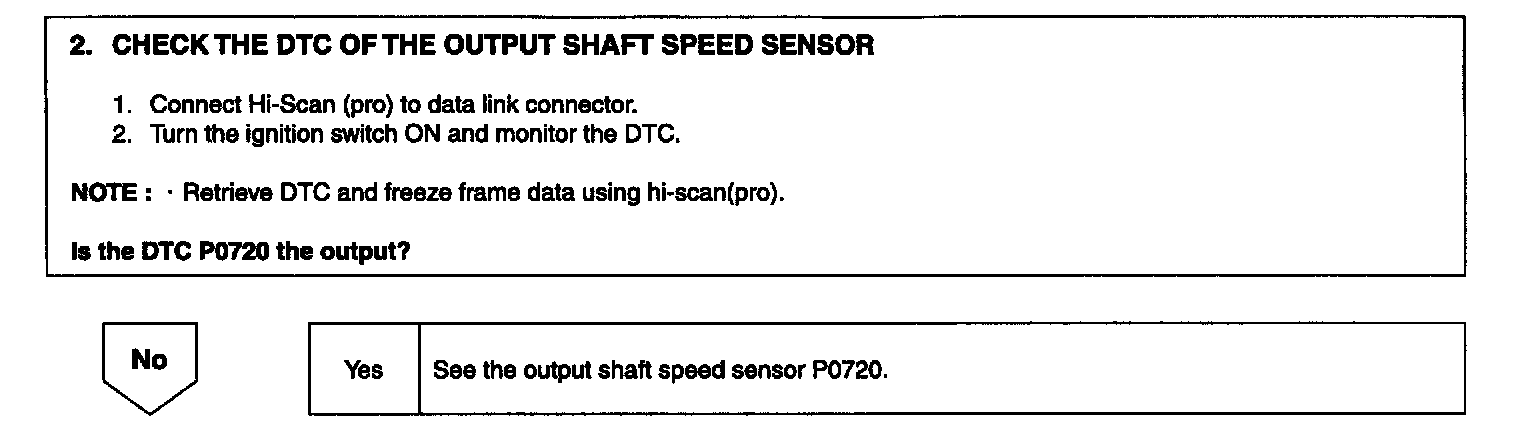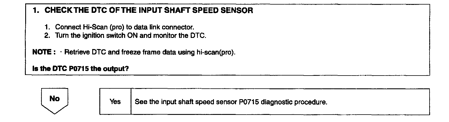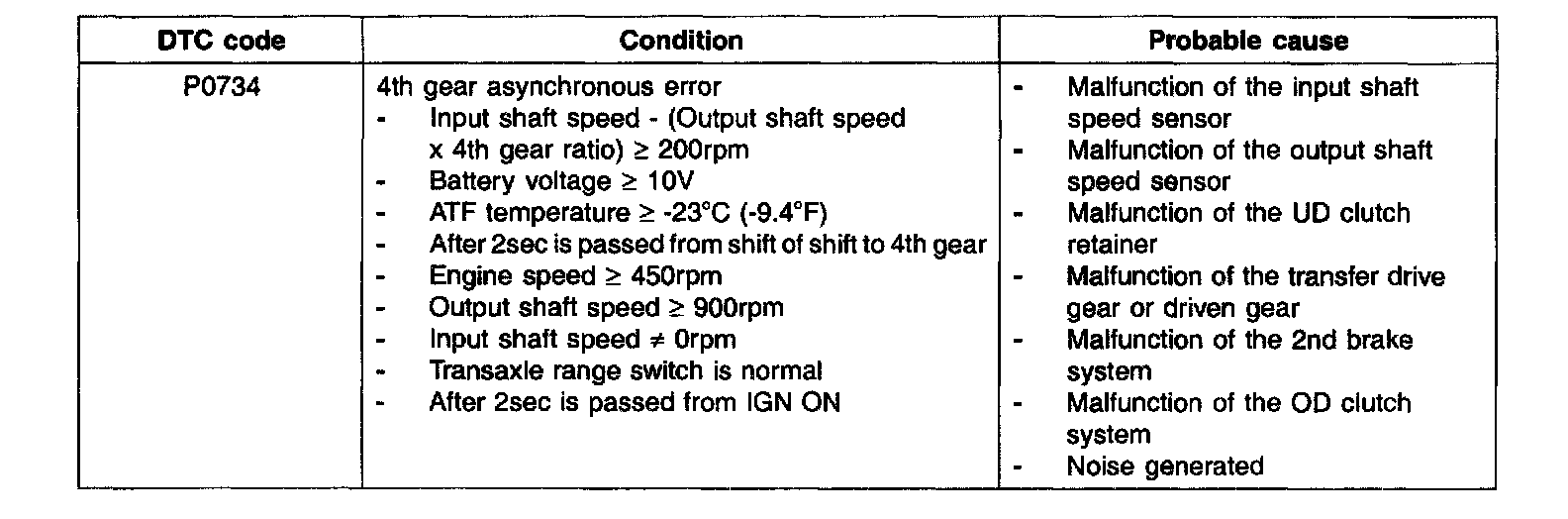 If the value resulting from driving the input shaft rotation speed output by the 4th gear ratio does not match the output shaft rotation speed output after 4th gear is engaged, DTC P0734 is output.