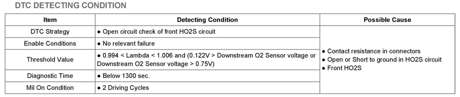 The PCM monitors front HO2S tip temperature and signal at the same time to check open circuit of Pumping Current Circuit (PCM PIN No. 19). The PCM sets DTC P2237 if front O2 tip temperature is higher than the predetermined threshold and front HO2S signal stuck is detected. If the same error code is set in the next driving cycle, the PCM illuminates the MIL.