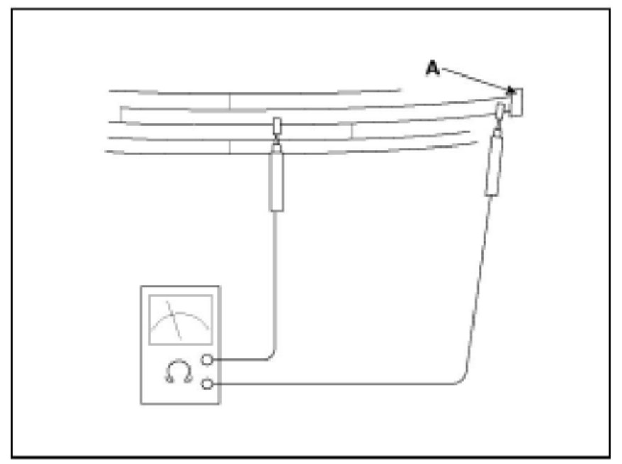 2. Touch one tester probe to the glass antenna terminal (A) hear, and move the other tester probe along the antenna wires to check that continuity exists.