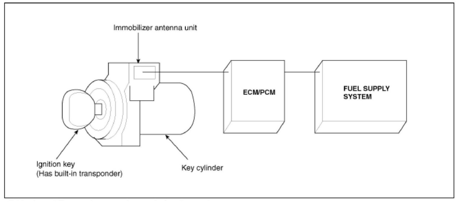 When the key is inserted in the ignition and turned to the ON position, the immobilizer antenna unit sends power to the transponder in the ignition key. The transponder then sends a coded signal back through the immobilizer antenna unit to the ECM/PCM.