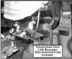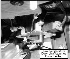 To reduce incidence of temperature door actuator links becoming disconnected, the actuator and link have been changed from 9/4/02 production. The new link connects to the actuator from the top instead of the bottom to reduce the risk of the link being kicked loose by the passenger's feet.