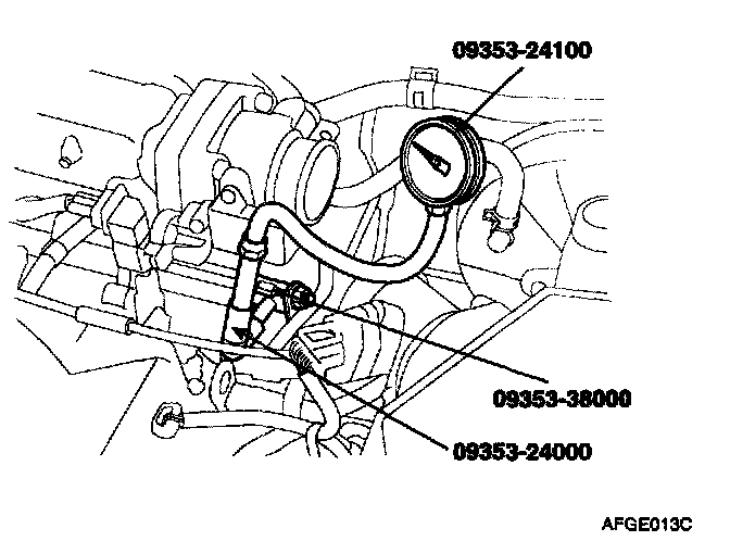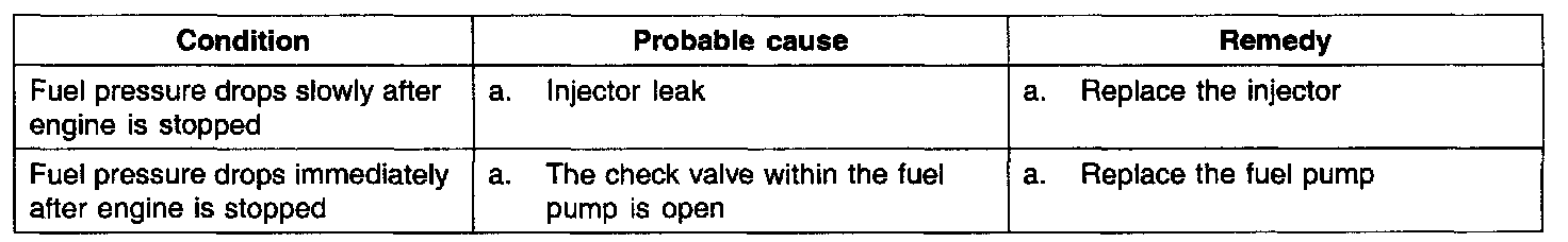 11. Stop the engine and check for a change in the fuel pressure gauge reading, which should hold for approximately 5 minutes. If the gauge indication drops, observe the rate of drop. Determine and correct the causes according to the following table.