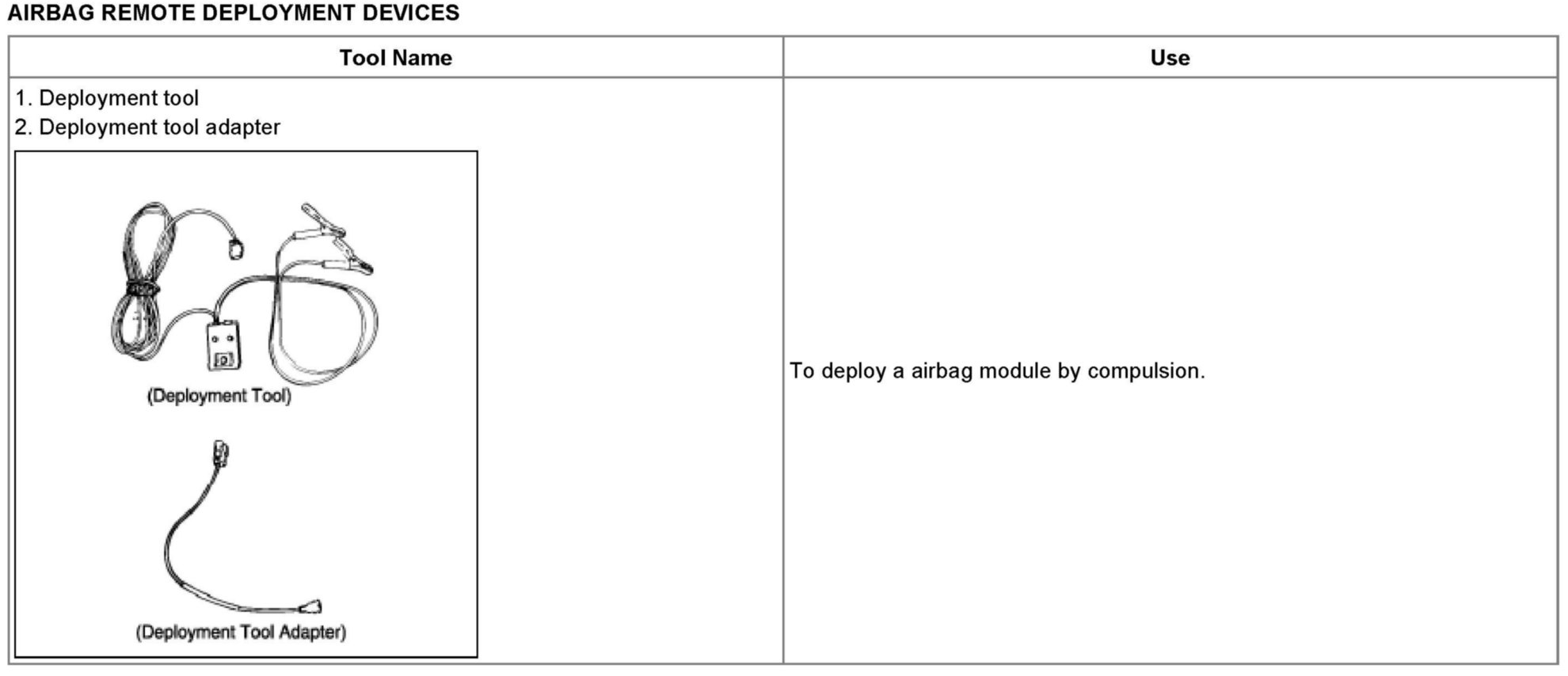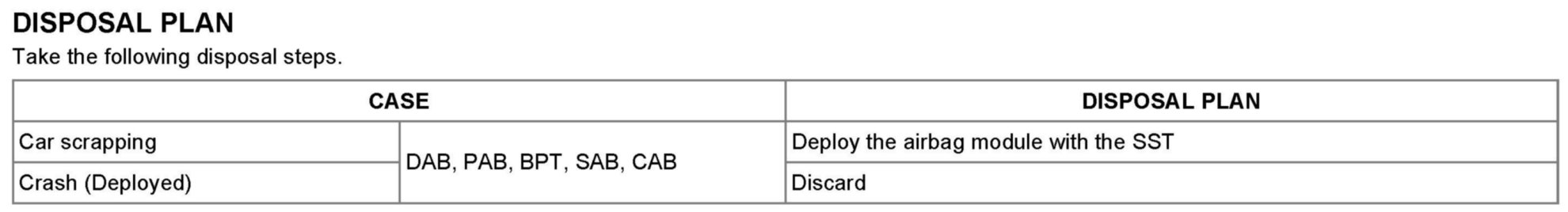 Before disposing of a vehicle equipped with an airbag, or prior to disposing of the airbag module, be sure to first follow the procedures to deploy the airbag.