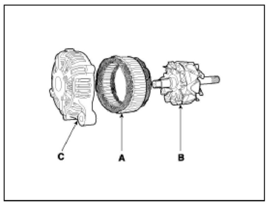 7. Disconnect the stator (A), rotor (B) and front bracket (C).