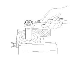 8. Mount the pulley in a vise and remove the pulley nut and the spring washer.