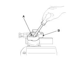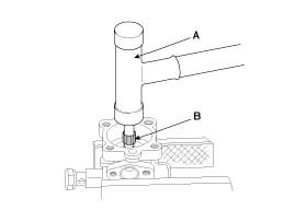 11. Tap the rotor side of the shaft slightly with a plastic hammer (A) to remove the shaft (B).