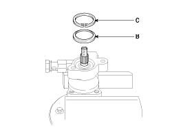 3. After inserting the shaft assembly (A) into the pump body, install the dust spacer (B) and snap ring (C).