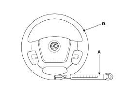3. Measure the turning force with a spring scale (A) by turning the steering wheel (B) clockwise and counterclockwise one and a quarter turns.