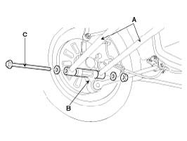 1. Remove the bolt (C) fixing the trailing arm (A) to the rear carrier (B).