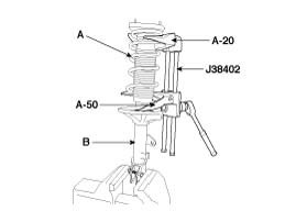 1. Using the Special Tools (J38402, A-20 and A-50), compress the coil spring (A) until there is only a little tension on the strut (B).
