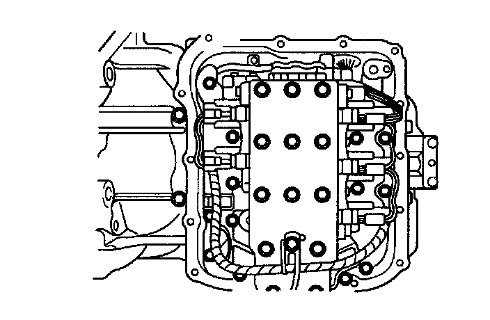 14. Remove 28 of the valve body mounting bolts. Do not remove the bolts shown in the illustration at this time.