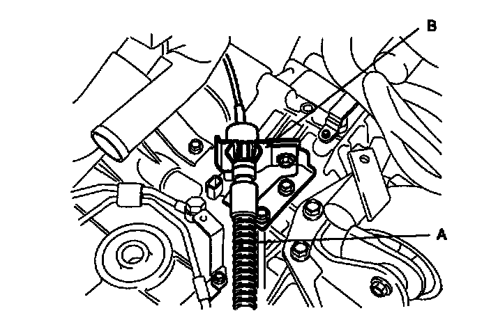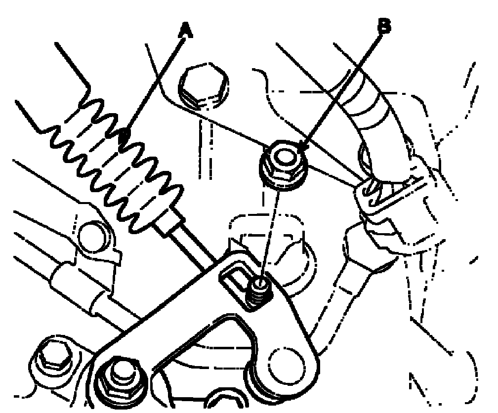 7. Remove the control cable(A) to transaxle range switch mounting nut(B).