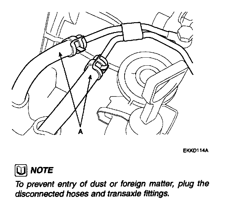 NOTE: To prevent entry of dust or foreign matter, plug the disconnected hoses and transaxle fittings.