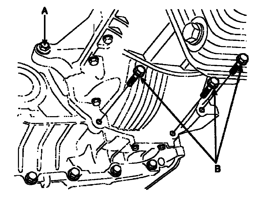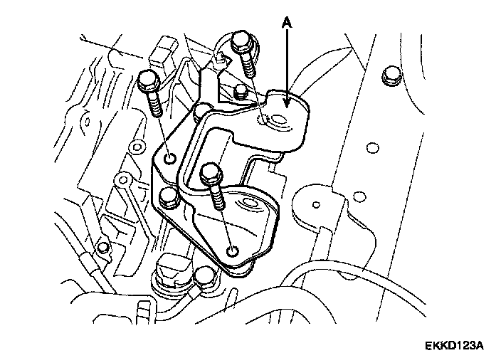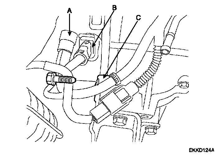 19. Remove front oxygen sensor, engine oil pressure switch(A), crank position sensor(B) connector mounting bracket(C).