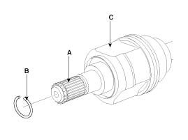 1. Remove the clip (B) from drive shaft splines (A) of the transaxle side TJ case (C).