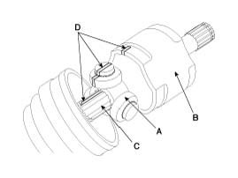 2) Make alignment marks on spider roller assembly (A), TJ case (B), and shaft splines (C) to aid reassembly.