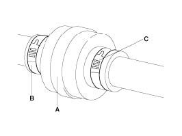 CAUTION: Wrap tape (B) around the driveshaft splines (C) to protect the boot (A).