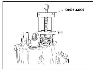 10. Remove the fifth synchronizer hub, the ring with fifth speed gear and the needle roller bearing using the special tool(09495-33000).