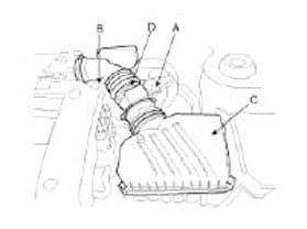 2) Air cleaner upper cover(C) and air intake hose(D).