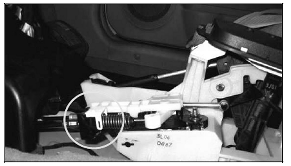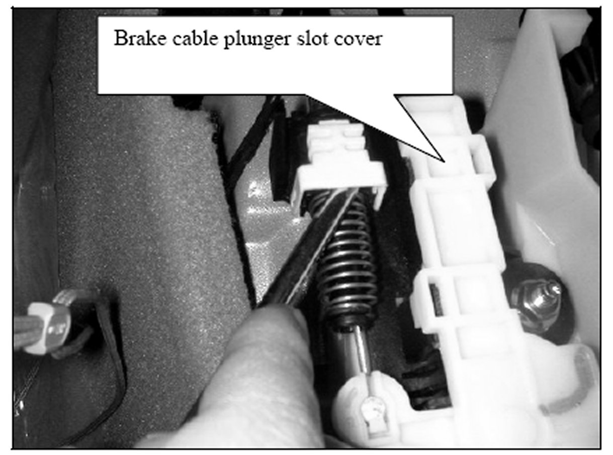 5. Remove the white plastic cover from the top of the brake cable plunger slot. With the vehicle in park and foot off of the brake, check for interference between the end of the brake cable plunger and the key lock cable lever as shown. The brake cable plunger must move freely past the key lock cable end and touch the middle of the key lock cable lever as shown in the picture.