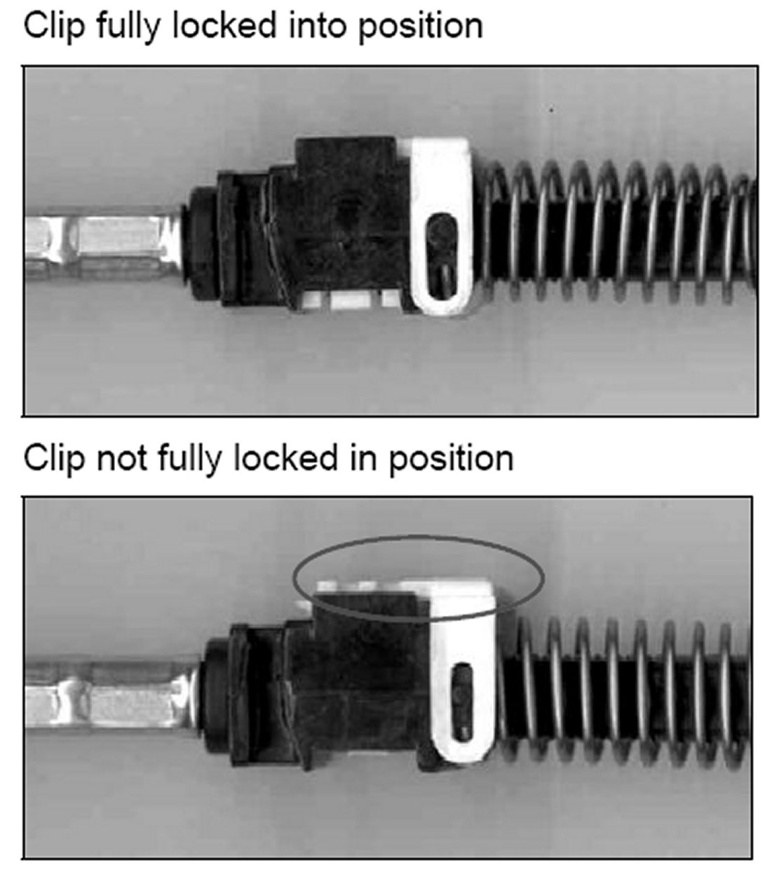 4. Push the cable forward until there is a gap between the collar of the cable and the block of 2 to 4mm. Then while holding the cable in position, push the clip down until it is in the locked position. It may require a strong push to seat it.