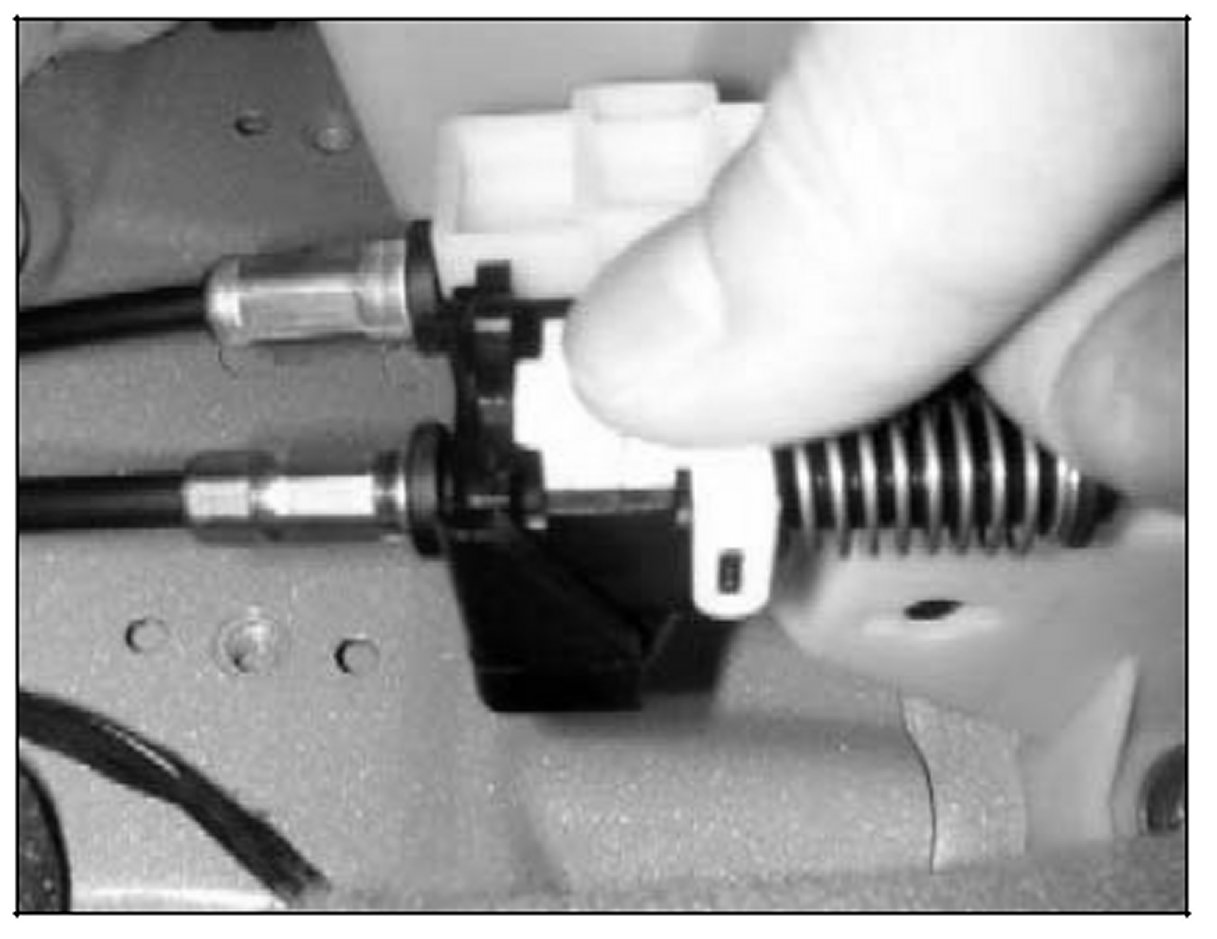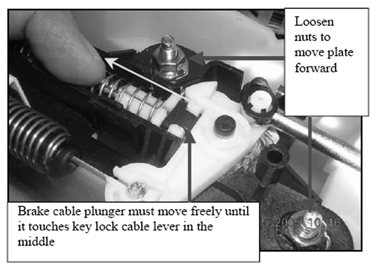 6. Correct interference between the end of the brake cable plunger and the key lock cable lever by moving the key lock and brake cable base plate. Loosen the two 10mm nuts and slide the black base plate forward until the key lock cable lever moves out of the way of the brake cable plunger allowing it to slide all the way back until it hits the middle of the key lock cable lever as shown in the picture. Replace the brake cable plunger cover and tighten 10mm nuts.