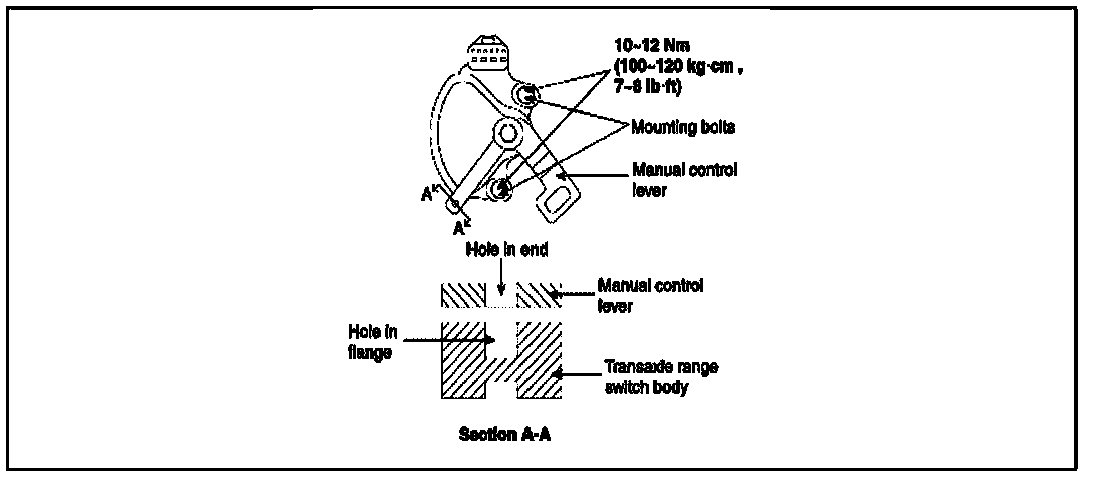 - Loosen the transaxle range switch body mounting bolts and then turn the transaxle range switch body so the hole in the end of the manual control lever and the hole (cross section A-A in the figure) in the flange of the transaxle range switch body flange are aligned.