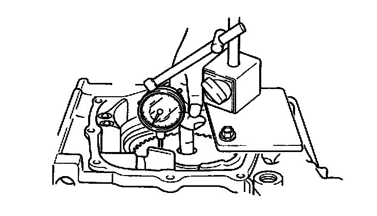 19. Turn the transaxle upside down, install a dial indicator, as shown in the illustration.