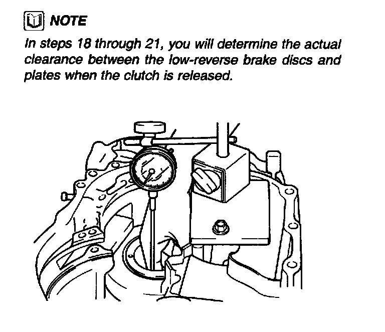 NOTE; In steps 18 through 21, you will determine the actual clearance between the low - reverse brake discs and plates when the clutch is released.