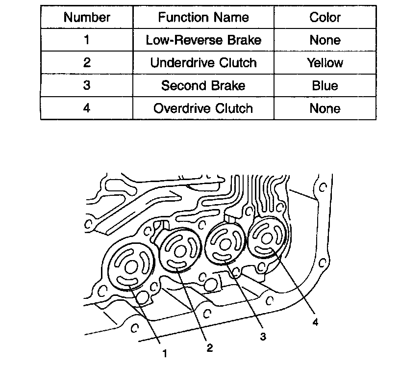 79. Install the accumulators with the springs according to the illustration and the chart below. The accumulators should be flush with the transaxle case.