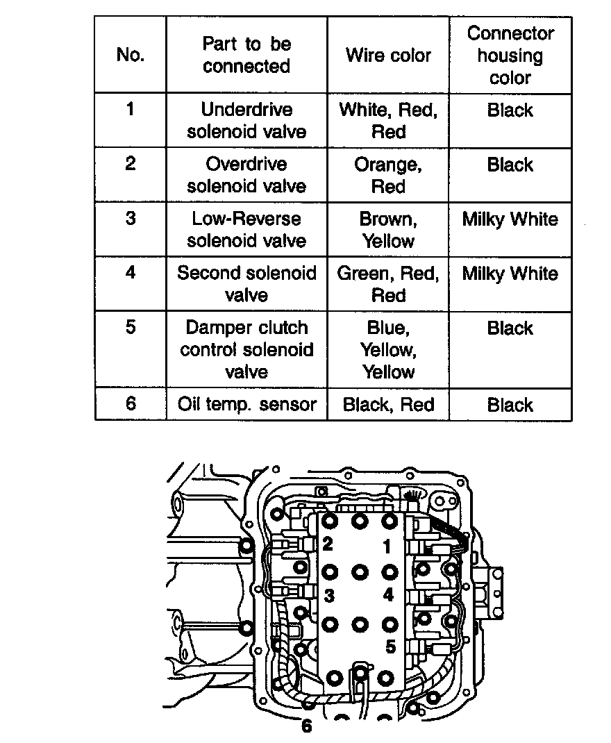 85. Connect the solenoid wiring and temperature sensor connectors according to the illustration and the chart.