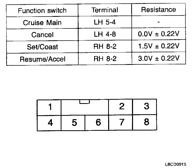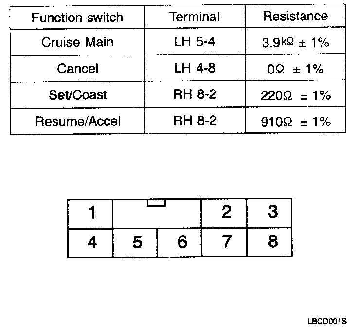 2. Measure resistance between terminals on the control switch when each function switch is ON (switch is depressed).
