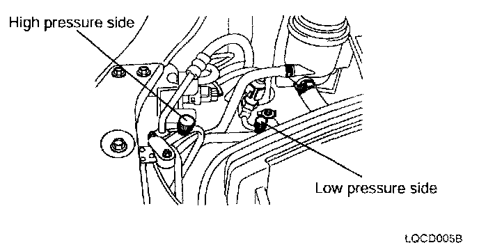 2. Connect a R-134a refrigerant Recovery/Recy-cling/Charging System to the high-pressure service port and the low-pressure service port as shown, following the equipment manufacturer's instructions.