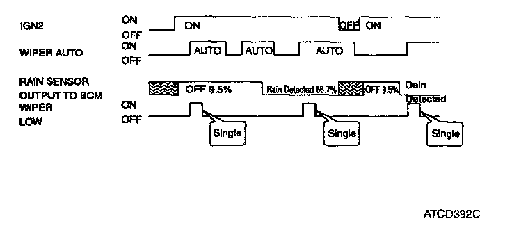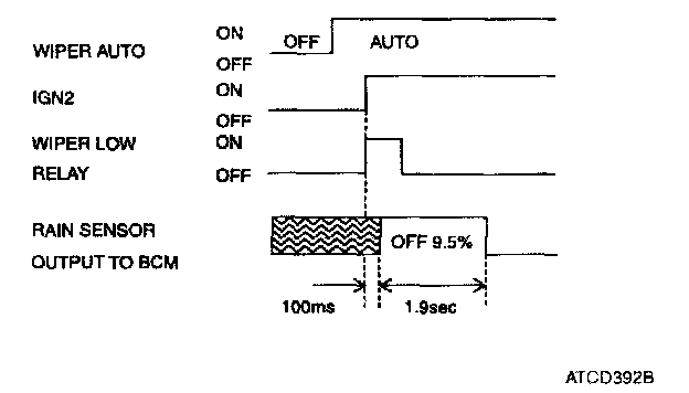 In IGN2 ON state, if auto SW input (UN communication) is ON then both wiper low relay and wiper high relay outputs are controlled by the rain sensor input signal 1 When the wiper switch is moved to auto position and the Ignition switch is in IGN2 position, the Rain sensor is considered to be in "automatic" mode
