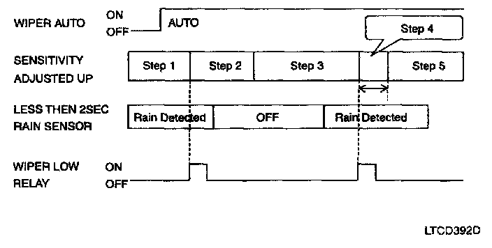 The drive may adjust the rain sensor performance by adjusting the sensitivity input When in AUTOMATIC mode, the BCM will perform a single wipe each time the sensitivity is adjusted upward to a more sensitive setting(downward more then one step). This single wipe will only be performed if Rain Detected signal is being received from the Rain sensor. If the sensitivity adjustment is adjusted upward more than one sensitivity, the BCM will only perform a single wipe unless the time between Increases is more than 2 seconds.