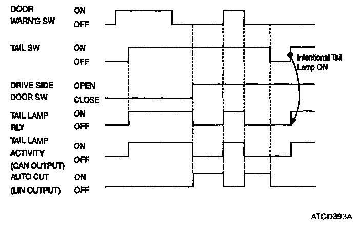 The auto-cut strategy ensures that tail lamps are turned off even if the driver forgets to turn them off. The tail lamp is turned On by tail SW after door warning SW (KEY IN) ON, then after if the user sets door warning SW (KEY IN) OFF and opens the driver side door, the tail lamp is automatically cut. Also at the state door warning SW(KEY IN) ON, when door warning SW(KEY IN) is turned OFF after opens the driver side door, the tail lamp is automatically cut. (The switch detection sequence of door warning SW (KEY IN) and driver door SW is ignored.) After" AUTO CUT" , the " AUTO CUT" function is disabled and tail lights are turned On if the driver turns ON the tail SW or key in.