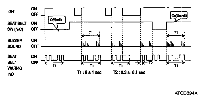 1. Seat belt warning lamp and warning sound stop at IGN1 OFF during the operation. With a seat belt SW on, warning sound stops immediately but seat belt warning indicator continues working for the remained time.