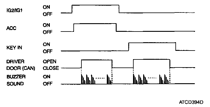 2. If the key is pulled out from key cylinder and ACC = IGN2 = IGN1 = OFF, or if driver side door is closed, then the key operated warning stops immediately.