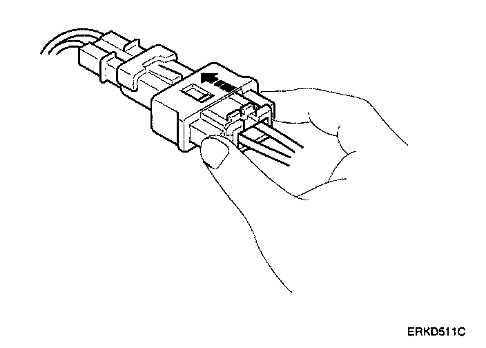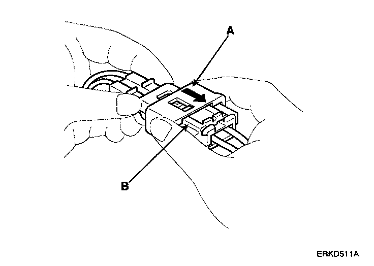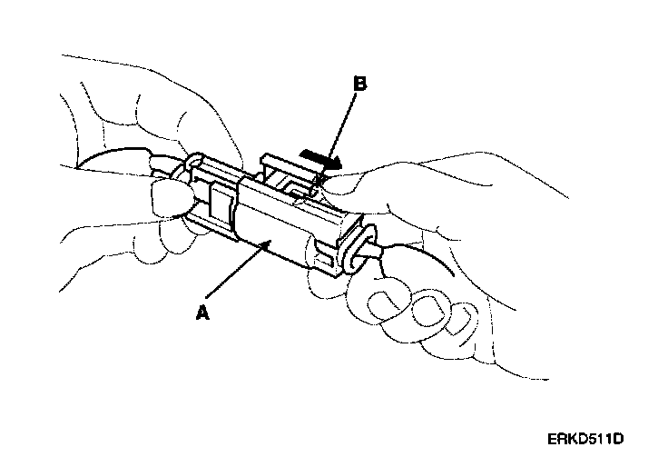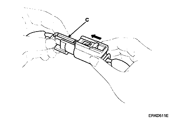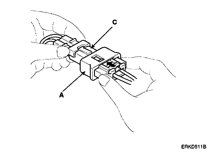 1. To reconnect, hold the pawl-side connector half, and press on the back of the sleeve-side connector half in the direction shown. As the two connector halves are pressed together, the sleeve (A) is pushed back by the pawl (C). Do not touch the sleeve.