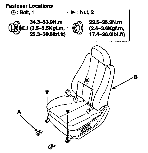 2. After loosening the seat assembly mounting bolts and nuts, remove the seat assembly (B).