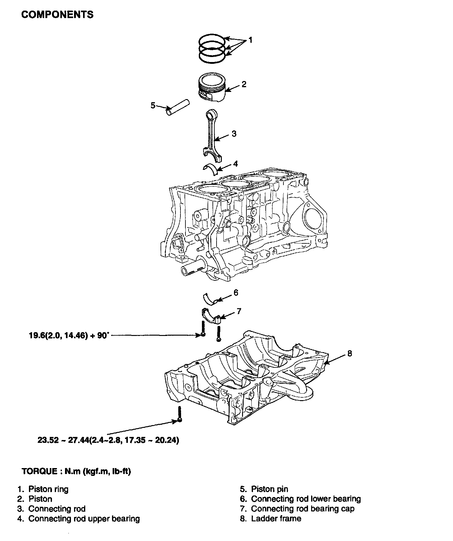 2) Push the piston, connecting rod assembly and upper bearing through the top of the cylinder block.