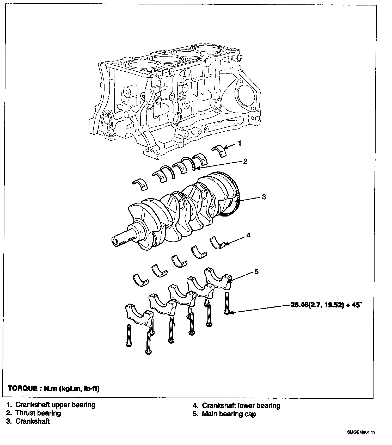 NOTE: Arrange the main bearings and thrust bearings in the correct order.