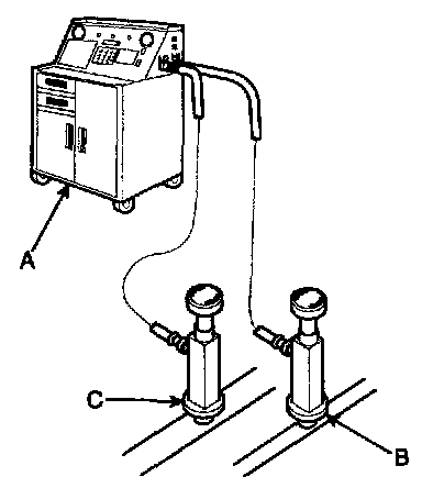 Recovery/Recycling/Charging System (A) to the high pressure service port (B) and the low-pressure service port (C) as shown, following the equipment manufacturer's instructions.