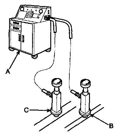 Recovery/Recycling/Charging System (A) to the high pressure service port (B) and the low-pressure service port (C) as shown, following the equipment manufacturer's instructions.