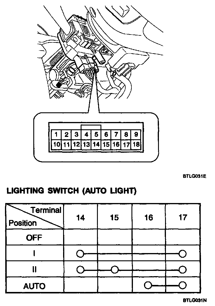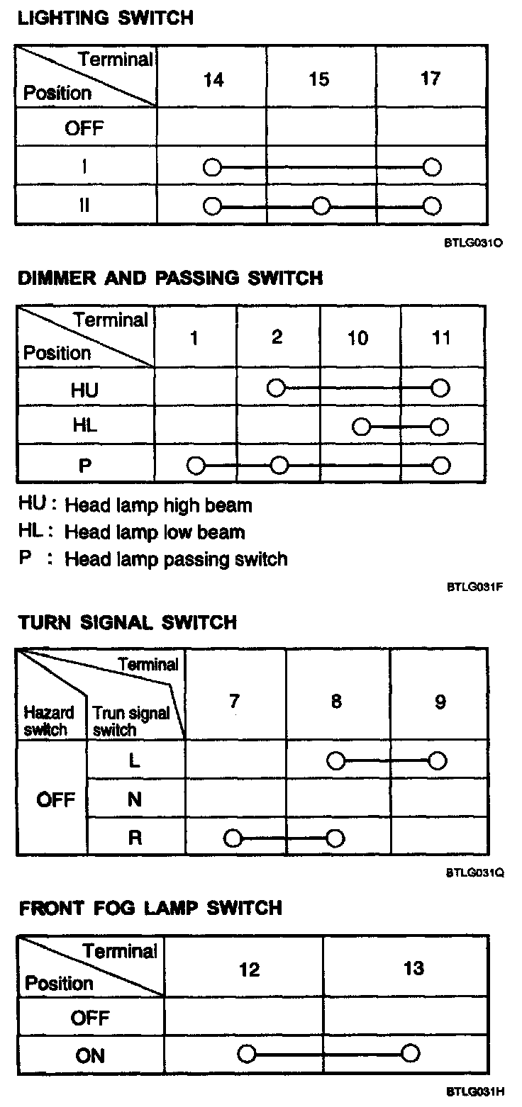 With the multi function switch in each position, make sure that continuity exists between the terminals shown. If continuity is not as specified, replace the multi-function switch.