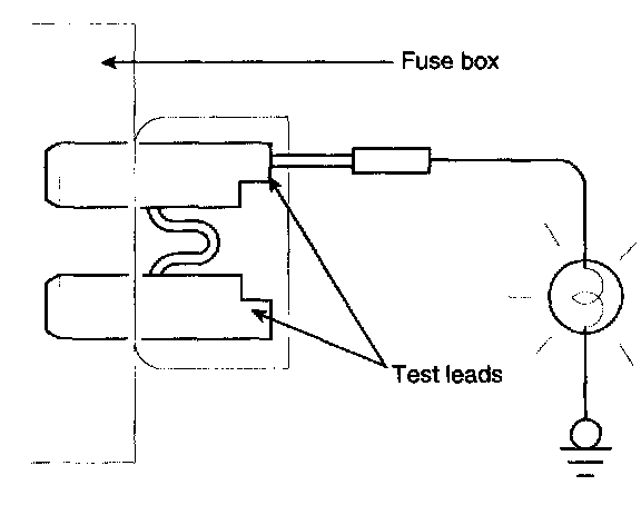A blade type fuse test taps provided to allow checking the fuse itself without removing if from the fuse box. The fuse is good if the test lamp lights up when one lead is connected to the test taps (one at a time) and the other lead is grounded. (Turn the ignition switch so that the fuse circuit becomes operative)