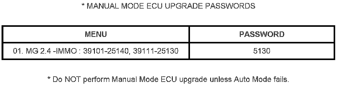 DO NOT attempt to perform a Manual Mode ECU upgrade unless Auto Mode fails. Always follow instructions given on the GDS tool in either Auto or Manual mode. See table for Manual Mode passwords.