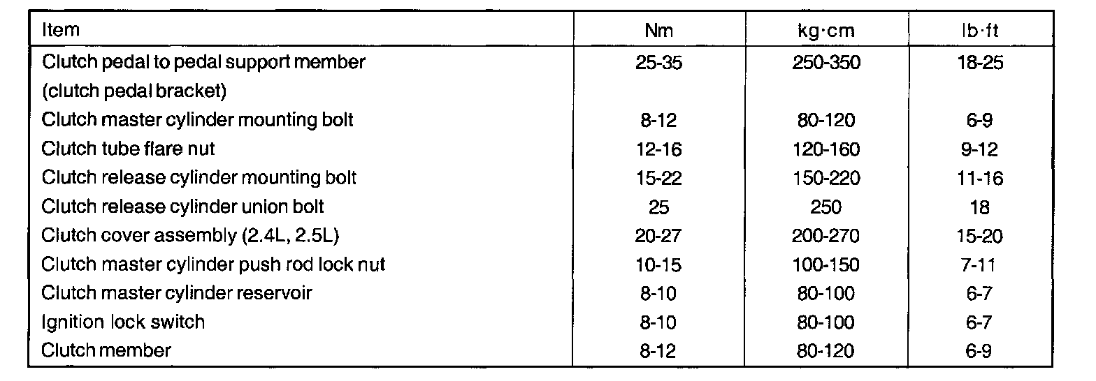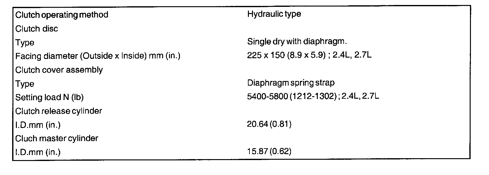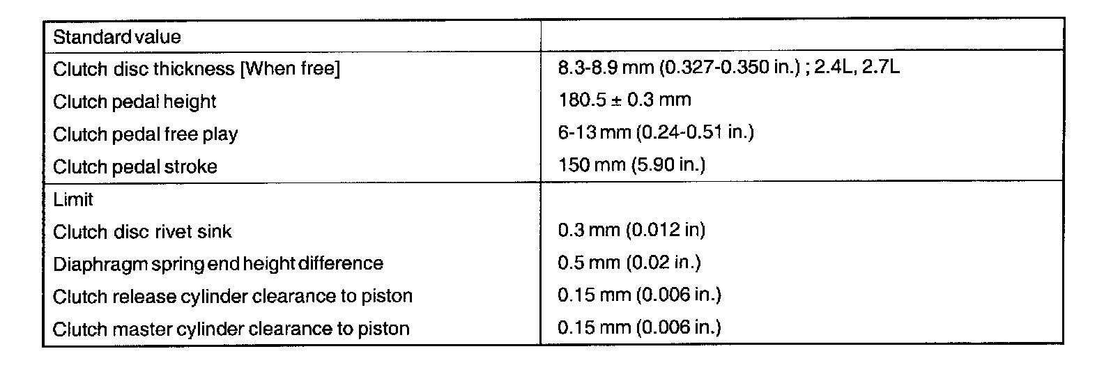Clutch disc thickness [When free] 8.3-8.9 mm (0.327-0.350 inch); 2.4L,2.7L