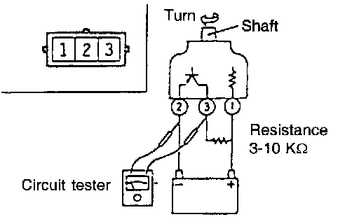 2) Turn the shaft of the vehicle speed sensor and check that there is voltage between terminals 2-3 (1 turn=4 pulses).