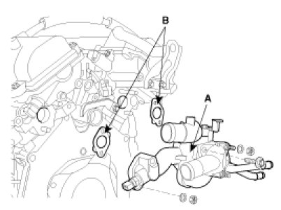 2. Install the water temperature control assembly(A) with a new gasket(B).